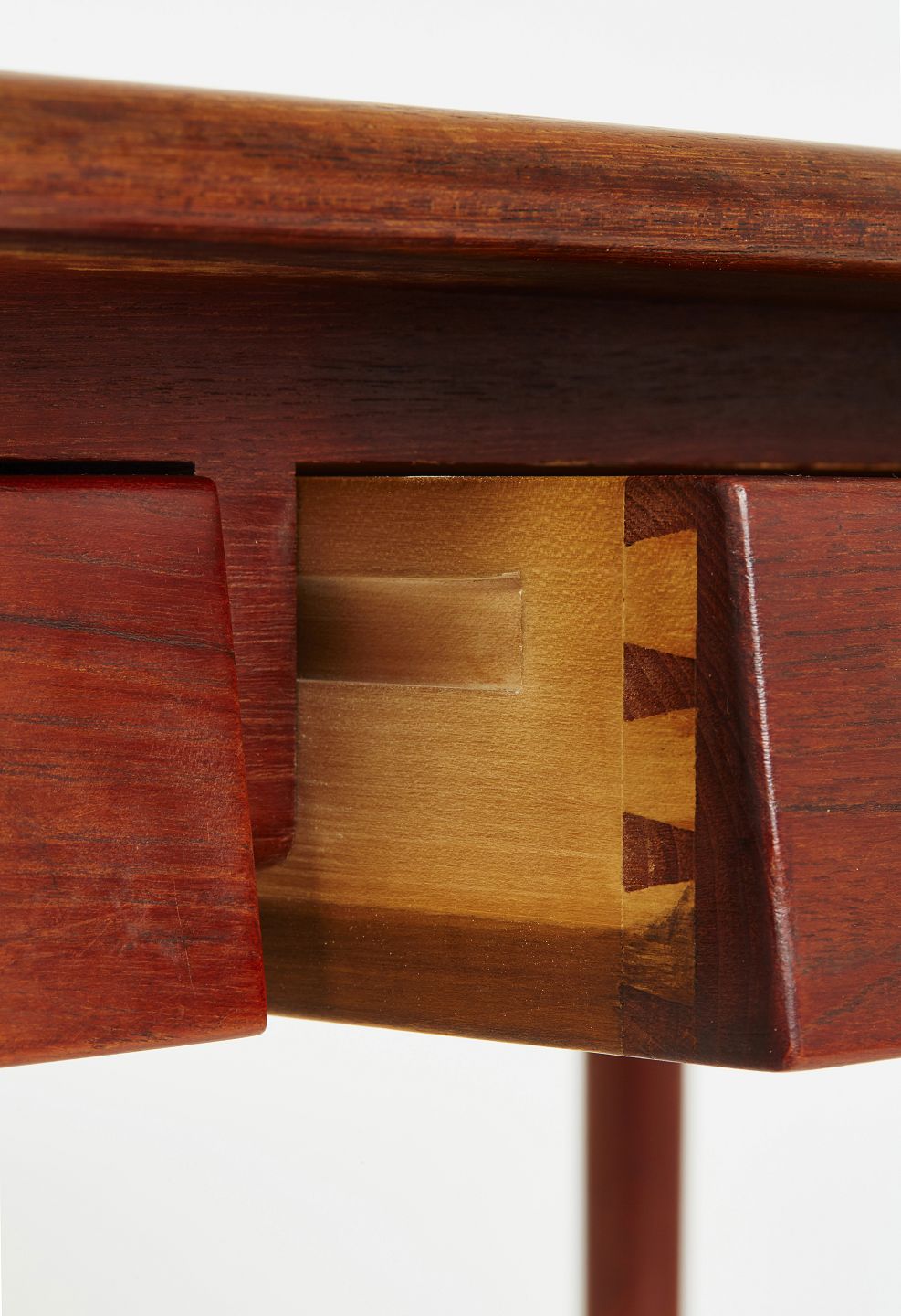 Front med tre skrå skuffer af massivt teaktræ og ahorn. H. B. D.