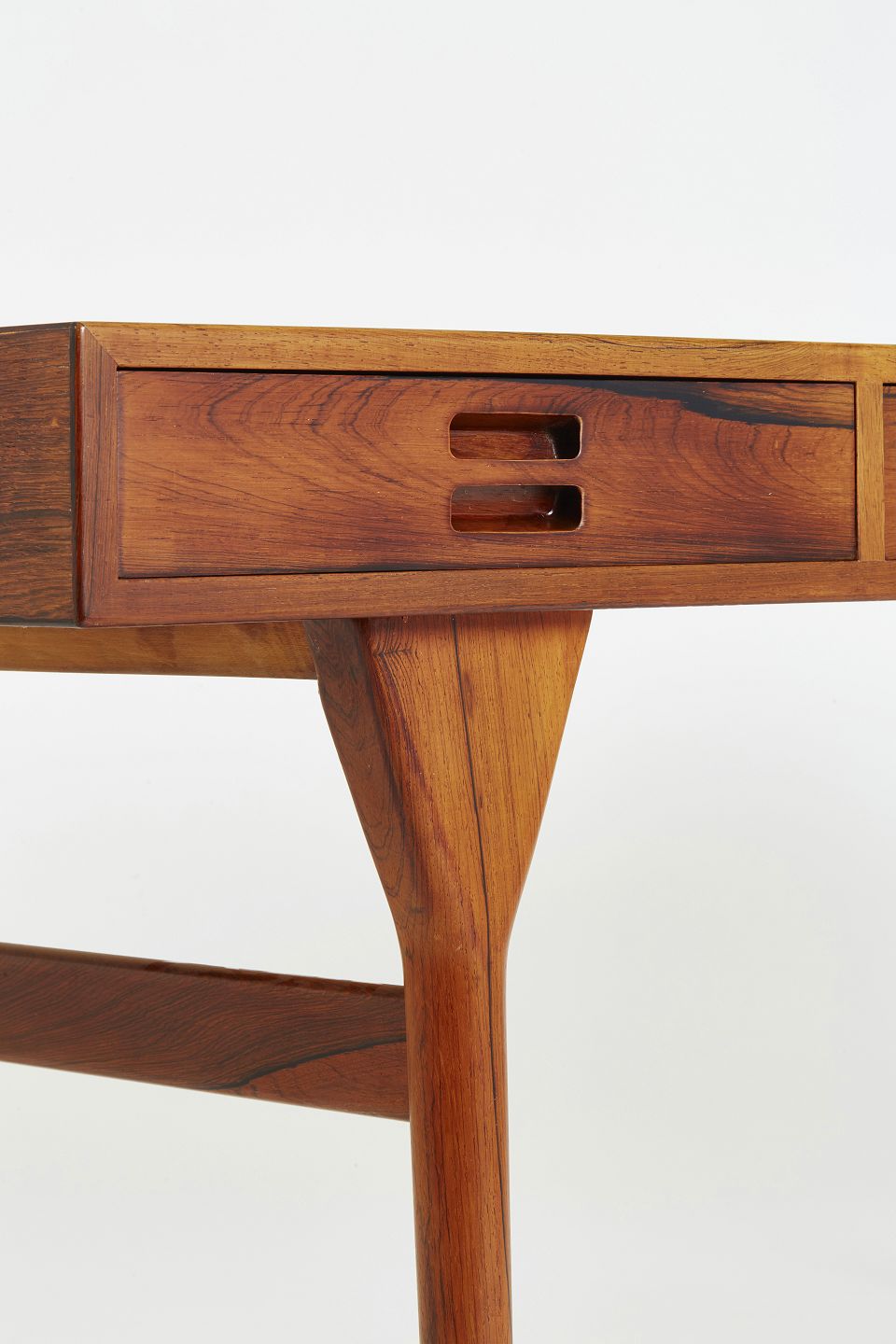 Fritstående kasetteformet skrivebord af palisander, sarg med fire integrerede skuffer, på runde kegleformede ben. Formgivet i 1958. Fremstillet hos Søren Willadsen, Vejen.