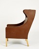 Øreklapstol med ben af lyst egetræ.Hynder med dunfyld og med originalt betræk i brunt læder. Velholdt stand med brugsspor.