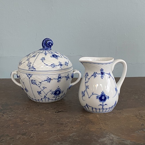 Musselmalet Sukkerskål nr 302 (Stor model H. 12 cm) & Flødekande (3sort) nr 802.